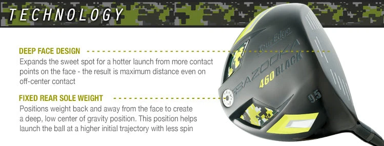 A rear fixed sole weight creates a deep center of gravity to help players of all abilities easily launch the ball down the fairway. The Bazooka 460 Black driver features a black PVD finish and ‘camo’ design highlights, combining style with power.